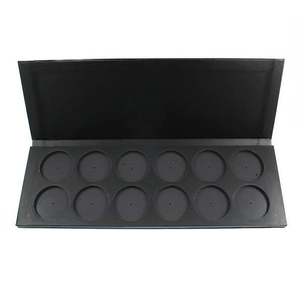 Slim, lightweight, black 12-pan empty blush palette. Standard industry size, will fit all standard blushes. Easy to rearrange with access via small pin hole at the bottom of each color.
